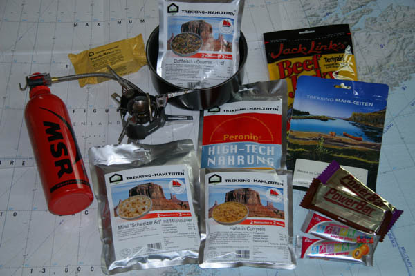 VERPFLEGUNG: Haben Sie jemals einen 30 Tage Vorrat eingekauft - und das in dem Wissen, dass Sie den nächsten Monat auch wirklich nur das essen dürfen, was jetzt im Einkaufswagen ist? Der Verpflegungsplan für eine Expedition muß detailiert ausgearbeitet sein. Der Plan muß sowohl den ernährungsphysiologischen Besonderheiten unter den zu erwartenden extremen Bedingungen gerecht werden, wie auch die Grenzen des tragbaren Gewichts und des zur Verfügung stehenden Volumens berücksichtigen. Für uns bedeutet dies, gut 4000 kcal pro Person und Tag so zu planen, dass das Ganze keine 70 kg wiegt und nicht mehr als das halbe Schlittenvolumen füllt (also nur einen Einkaufswagen voll für 2 Personen und 35 Tage). Darüber hinaus muss die Zubereitung möglichst brennstoffsparend sein. Den Großteil unseres Bedarfs decken wir deshalb mit hochwertiger Expeditionsnahrung der Firma Trekking-Mahlzeiten. Diese beinhaltet u.a. gefriergetrocknete Gerichte, Peronin Hi-tech Nahrung, Müslis, Milch- und Eipulver, Trekking Kekse, getrocknetes Rindfleisch, PowerBars und Viba Energie Fruchtschnitten. Ergänzend verwenden wir ca. 30% konventionelle Lebensmittel wie Trockenwurst, Käse, Schokolade, Kekse, Tee und Instant Suppen. |
